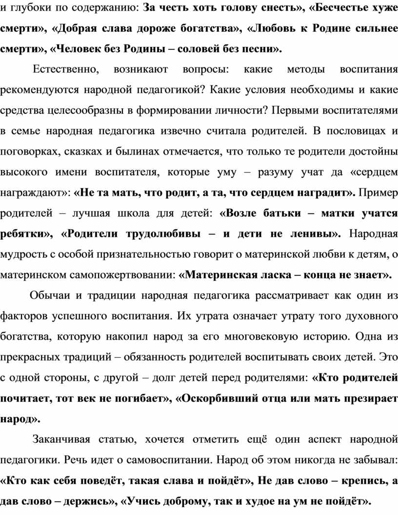 Многовековая практика воспитания детей в семье приводит к выводу о том, разумное воспитание-одна из непреходящих ценностей: «Человек без воспитания – тело без души», «Самое лучшее наследство- воспитание», «Дитятко – это тесто: как замесил, так и выросло». Заботу о воспитании детей, характер отношения, умение воспитывать народ рассматривает как показатель нравственной красоты человека, его духовной щедрости. «Не тот отец – мать, кто родил, а тот, кто вспоил, вскормил, да добру научил», «Не чванься отцом – хвались сыном молодцом».