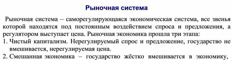 Рыночная система – саморегулирующаяся экономическая система, все звенья которой находятся под постоянным воздействием спроса и предложения, а регулятором выступает цена. Рыночная экономика прошла три этапа: