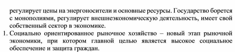 регулирует цены на энергоносители и основные ресурсы. Государство борется с монополиями, регулирует внешнеэкономическую деятельность, имеет свой собственный сектор в экономике.