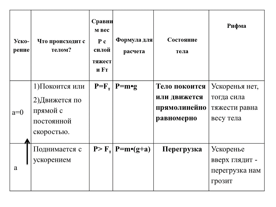 а | Поднимается с ускорением | Р> Fт | Р=m•(g+a) | Перегрузка | Ускоренье вверх глядит - перегрузка нам грозит |