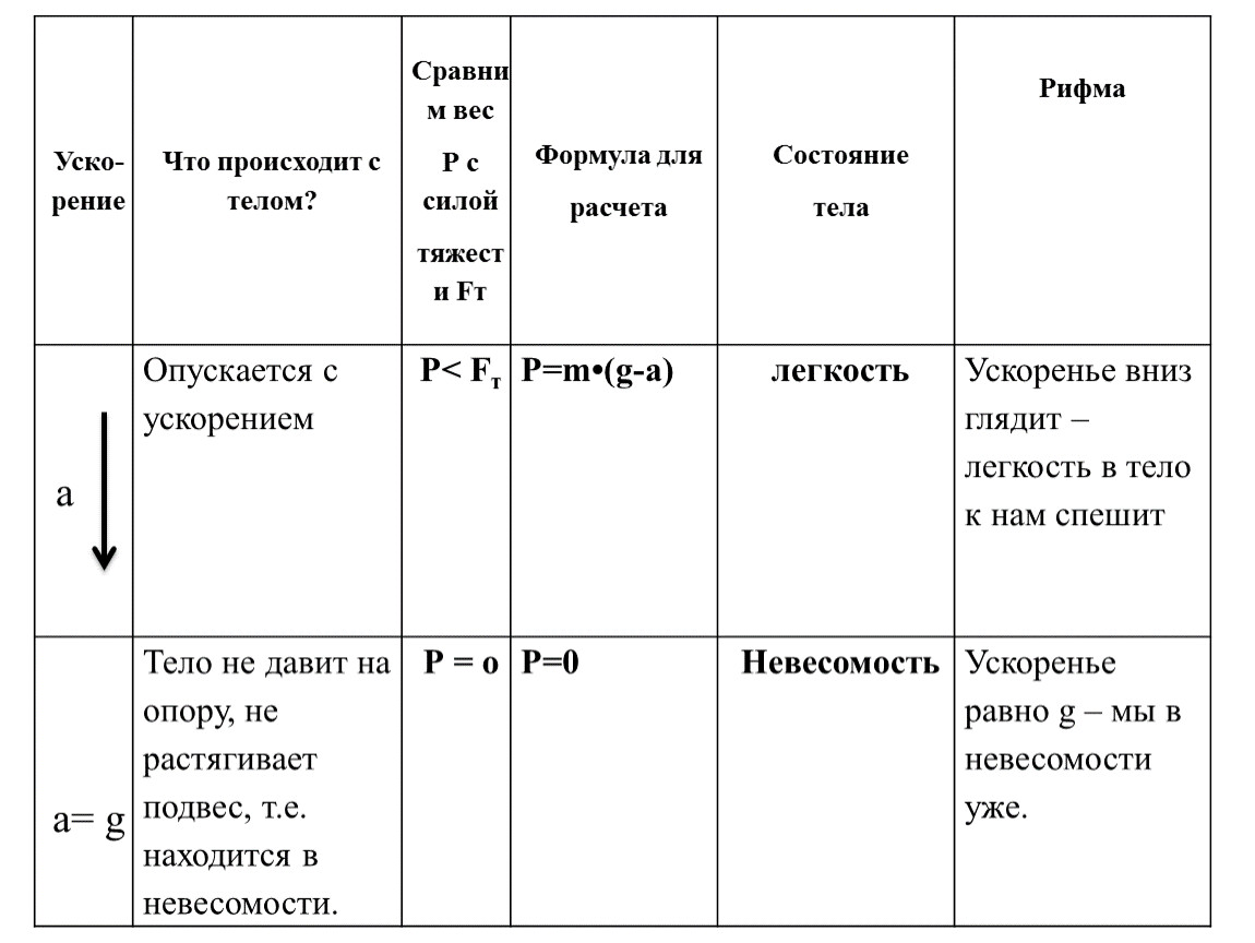 а | Опускается с ускорением | Р< Fт | Р=m•(g-a) | легкость | Ускоренье вниз глядит – легкость в тело к нам спешит |