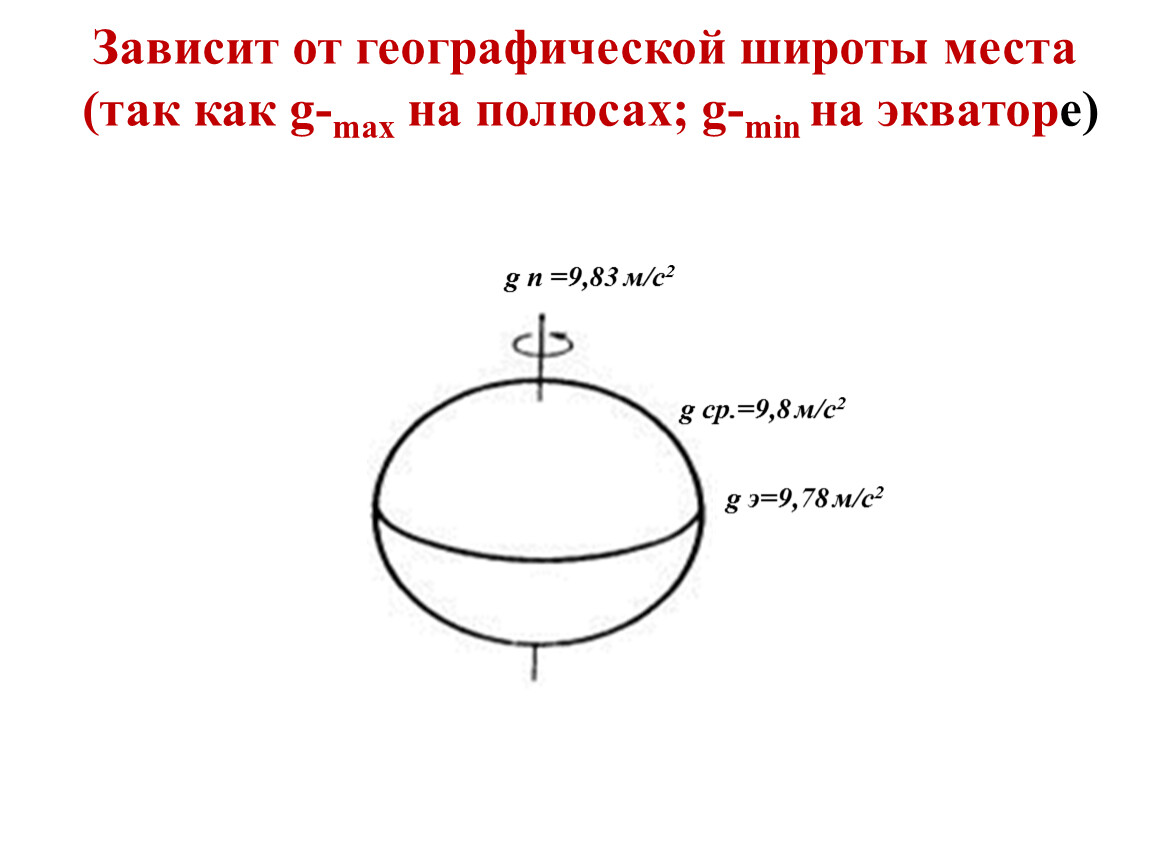 Зависит от географической широты места (так как g-max на полюсах; g-min на экваторе)