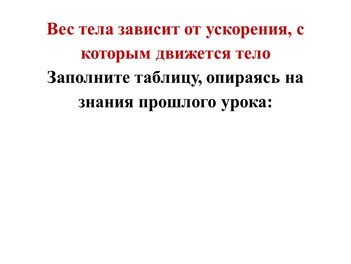 Вес тела зависит от ускорения, с которым движется телоЗаполните таблицу, опираясь на знания прошлого урока: