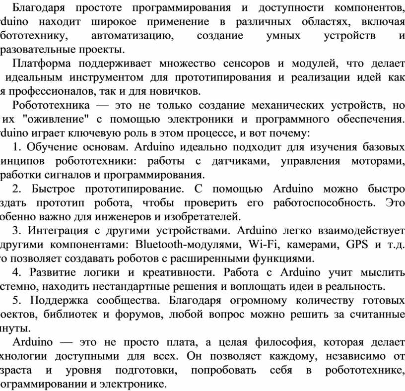 Благодаря простоте программирования и доступности компонентов, Arduino находит широкое применение в различных областях, включая робототехнику, автоматизацию, создание умных устройств и образовательные проекты.