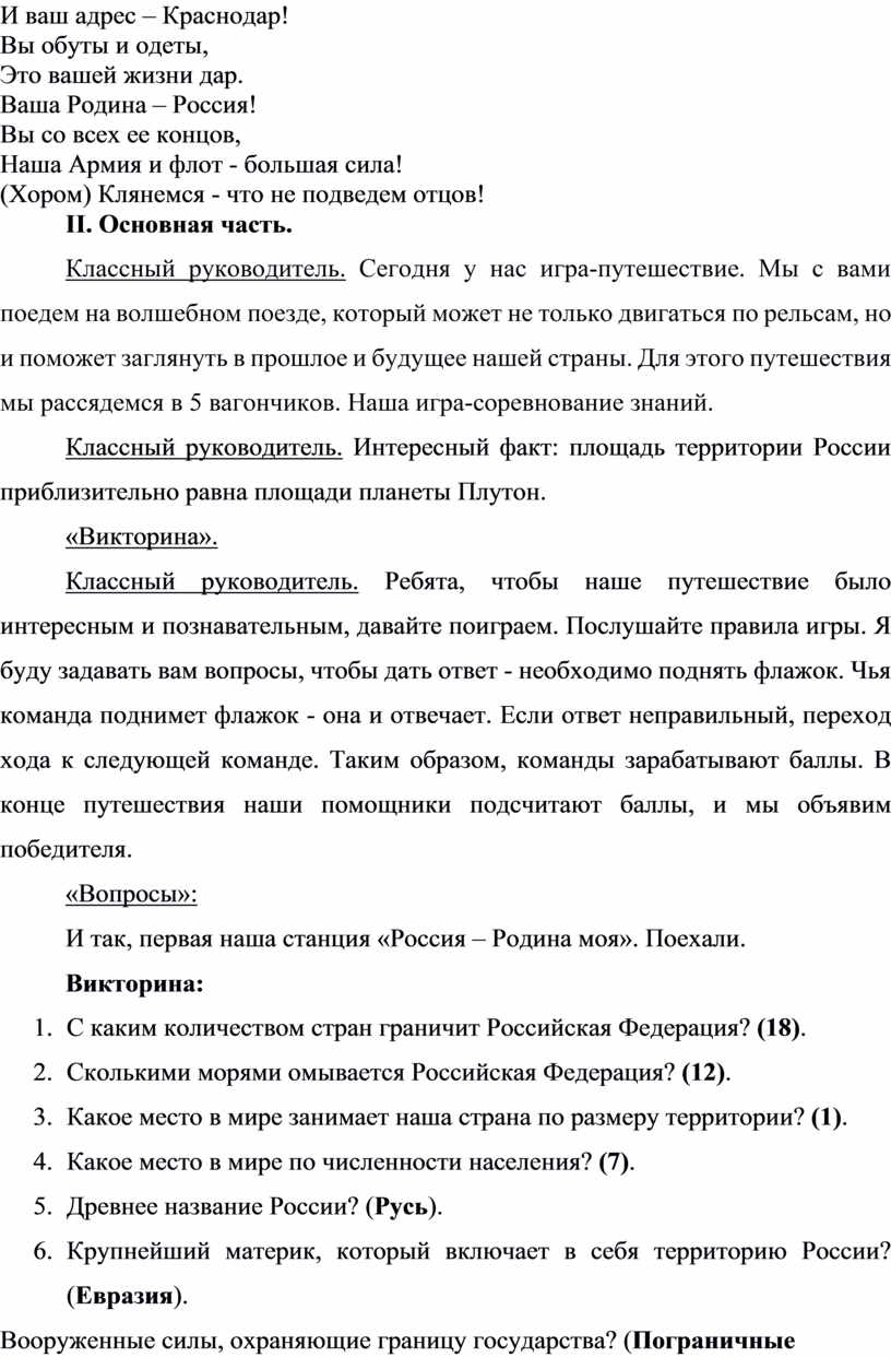 Классный руководитель. Сегодня у нас игра-путешествие. Мы с вами поедем на волшебном поезде, который может не только двигаться по рельсам, но и поможет заглянуть в прошлое и будущее нашей страны. Для этого путешествия мы рассядемся в 5 вагончиков. Наша игра-соревнование знаний.