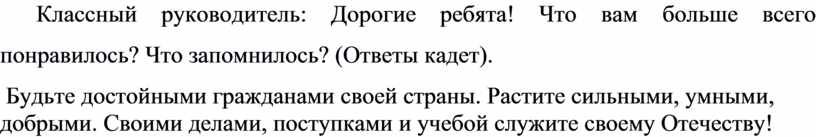 Классный руководитель: Дорогие ребята! Что вам больше всего понравилось? Что запомнилось? (Ответы кадет).