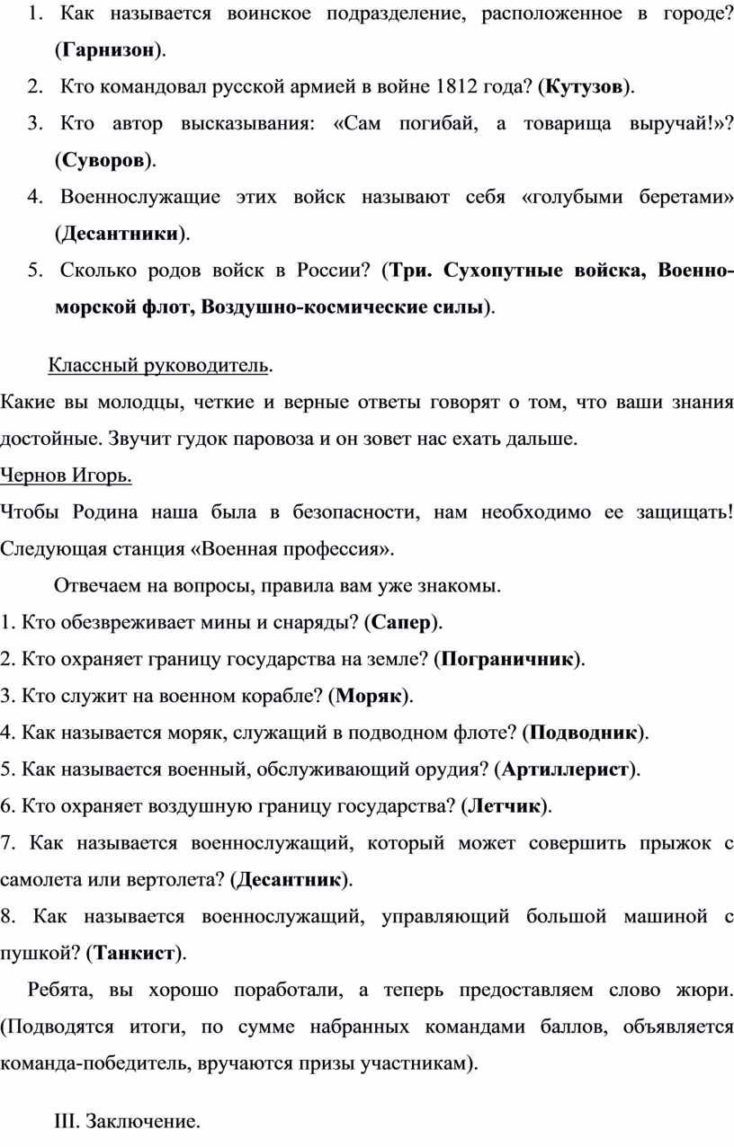 15. Сколько родов войск в России? (Три. Сухопутные войска, Военно-морской флот, Воздушно-космические силы).