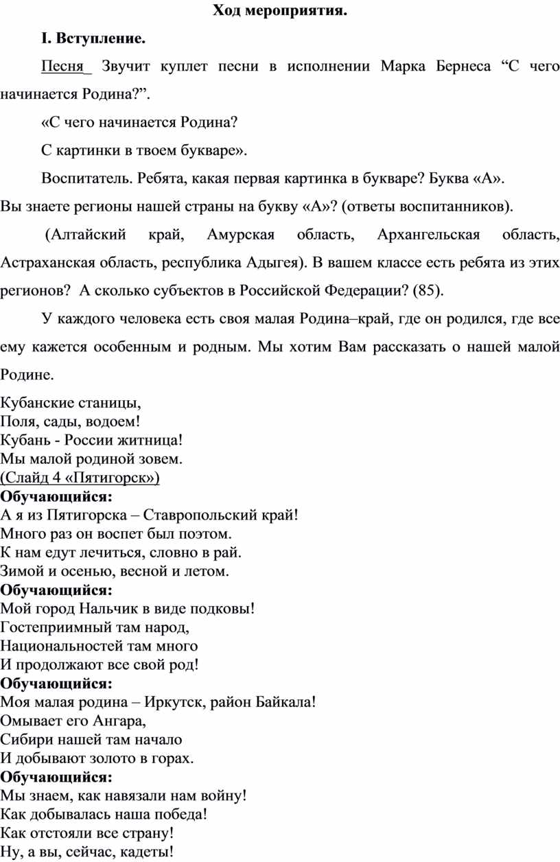 Родина, родной край—это все, что нас окружает, это то, что с первых дней нашей жизни становится для нас очень дорогим, как воздух, вода, еда, как улыбка близких людей. Это место, где живёт твой род, где мы растём, учимся, трудимся. Родина — это то, что есть сегодня: наши города и сёла, наши луга и леса, наш народ, наша школа. И то, что было раньше: наша история и культура, памятники и традиции. Это наша история. Это наши деды и прадеды. Это их дела, живущие рядом с нами в резных наличниках, в деревянных игрушках и диковинных храмах, в удивительных песнях и сказках.