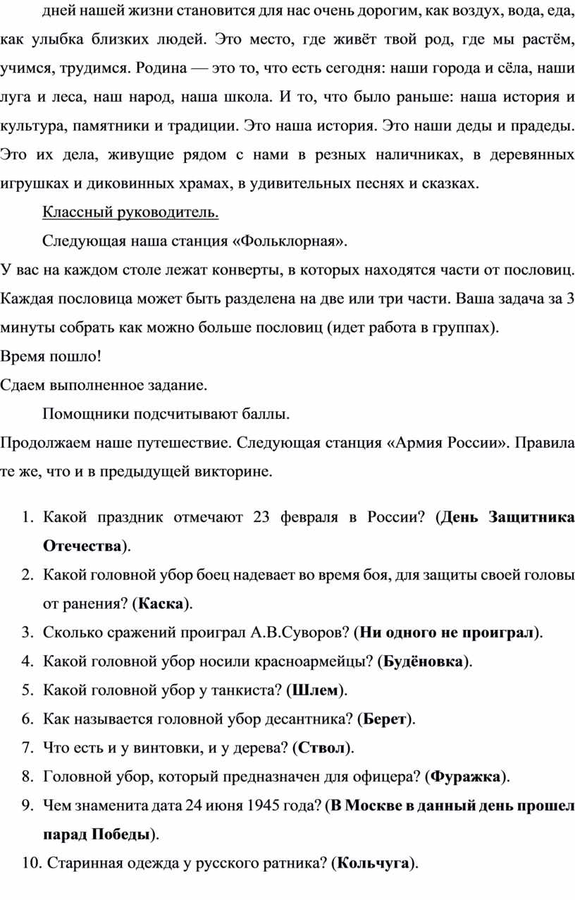 1. Какой праздник отмечают 23 февраля в России? (День Защитника Отечества).