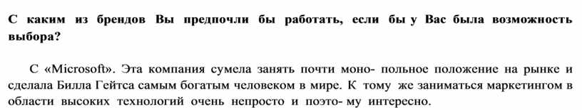 С «Microsoft». Эта компания сумела занять почти моно польное положение на рынке и сделала Билла Гейтса самым богатым человеком в мире. К тому же заниматься маркетингом в области высоких технологий очень непросто и поэто му интересно.