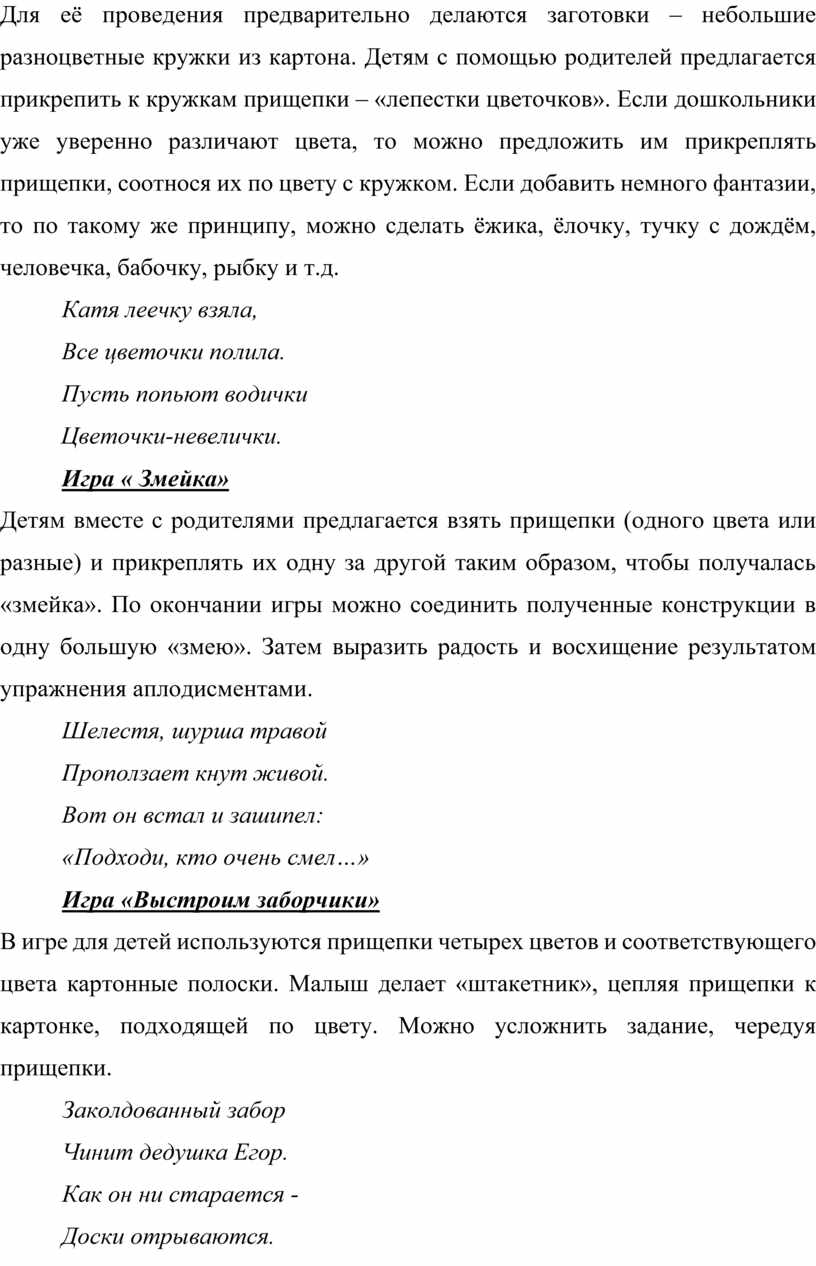 Детям вместе с родителями предлагается взять прищепки (одного цвета или разные) и прикреплять их одну за другой таким образом, чтобы получалась «змейка». По окончании игры можно соединить полученные конструкции в одну большую «змею». Затем выразить радость и восхищение результатом упражнения аплодисментами.