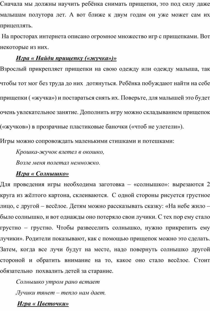 Взрослый прикрепляет прищепки на свою одежду или одежду малыша, так чтобы тот мог без труда до них дотянуться. Ребёнка побуждают найти на себе прищепки ( «жучка») и постараться снять их. Поверьте, для малышей это будет очень увлекательное занятие. Дополнить игру можно складыванием прищепок («жучков») в прозрачные пластиковые баночки («чтоб не улетели»).