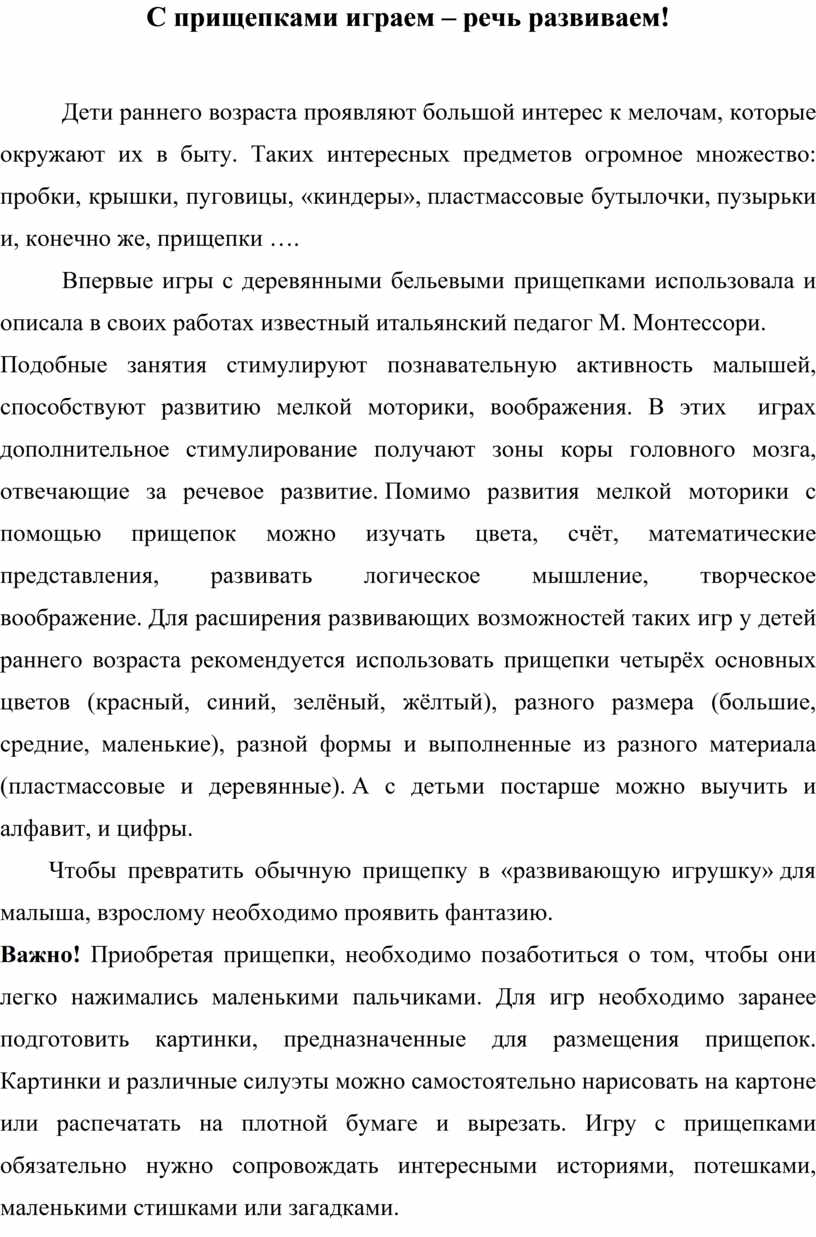 Впервые игры с деревянными бельевыми прищепками использовала и описала в своих работах известный итальянский педагог М. Монтессори.