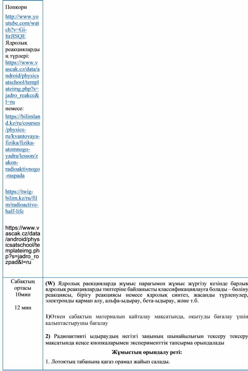 Кесте (таратпа материал) Попкорн http://www.youtube.com/watch?v=Gi-ItrJISQE Ядролық реакциялардың түрлері: https://www.vascak.cz/data/android/physicsatschool/templateimg.php?s=jadro_reakce&l=ru немесе: https://bilimland.kz/ru/courses/physics-ru/kvantovaya-fizika/fizika-atomnogo-yadra/lesson/zakon-radioaktivnogo-raspada