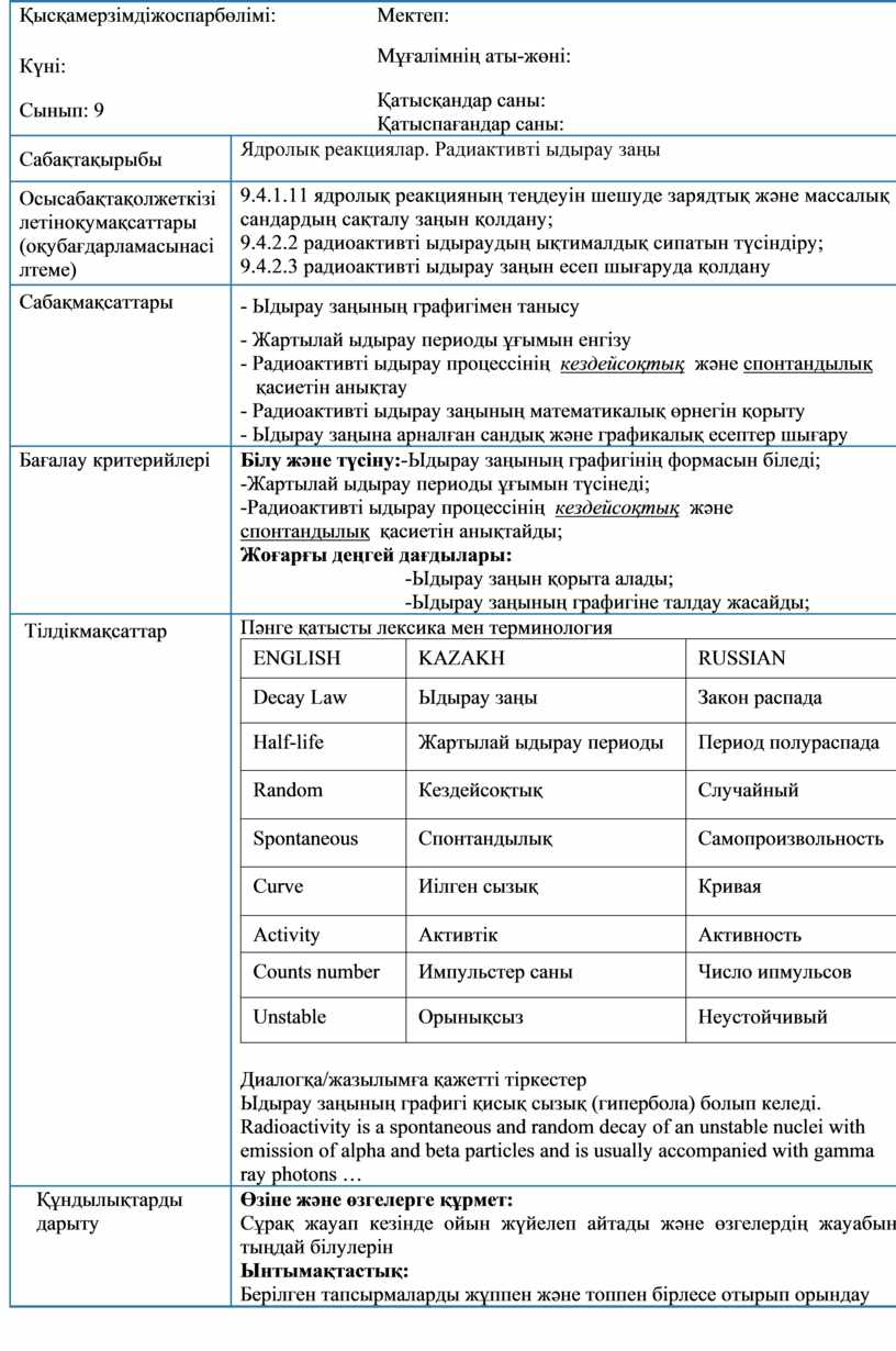 Білу және түсіну:-Ыдырау заңының графигінің формасын біледі; -Жартылай ыдырау периоды ұғымын түсінеді; -Радиоактивті ыдырау процессінің кездейсоқтық және спонтандылық қасиетін анықтайды; Жоғарғы деңгей дағдылары: -Ыдырау заңын қорыта алады; -Ыдырау заңының графигіне талдау жасайды; |