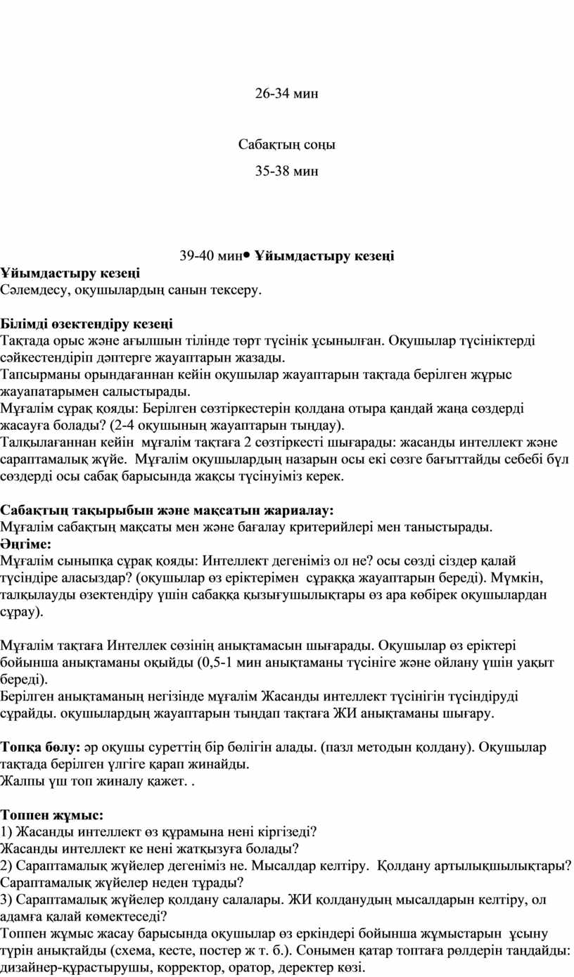 Сабақтың тақырыбын және мақсатын жариалау: Мұғалім сабақтың мақсаты мен және бағалау критерийлері мен таныстырады. Әңгіме: Мұғалім сыныпқа сұрақ қояды: Интеллект дегеніміз ол не? осы сөзді сіздер қалай түсіндіре аласыздар? (оқушылар өз еріктерімен сұраққа жауаптарын береді). Мүмкін, талқылауды өзектендіру үшін сабаққа қызығушылықтары өз ара көбірек оқушылардан сұрау).