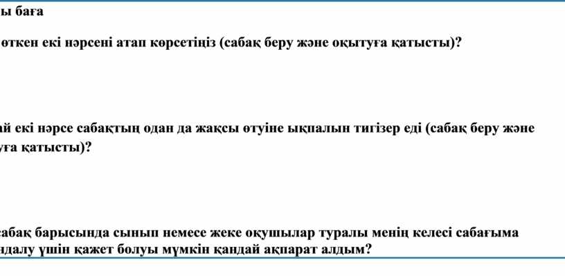 Жалпы баға Сәтті өткен екі нәрсені атап көрсетіңіз (сабақ беру және оқытуға қатысты)? 1: 2: Қандай екі нәрсе сабақтың одан да жақсы өтуіне ықпалын тигізер еді (сабақ беру және оқытуға қатысты)? 1: 2: Осы сабақ барысында сынып немесе жеке оқушылар туралы менің келесі сабағыма дайындалу үшін қажет болуы мүмкін қандай ақпарат алдым? |