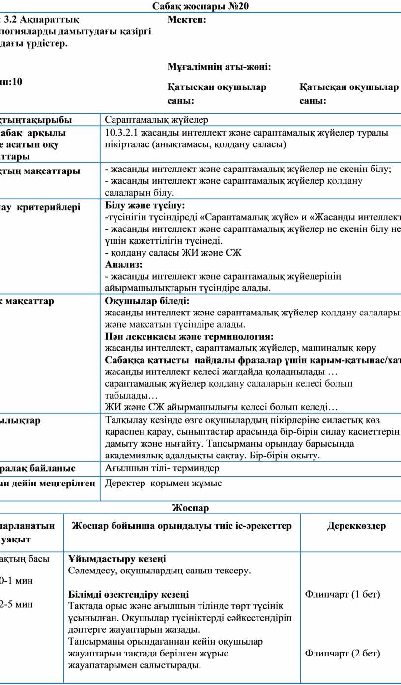 Оқушылар біледі: жасанды интеллект және сараптамалық жүйелер қолдану салаларын және мақсатын түсіндіре алады. Пән лексикасы және терминология: жасанды интеллект, сараптамалық жүйелер, машиналық көру Сабаққа қатысты пайдалы фразалар үшін қарым-қатынас/хат: жасанды интеллект келесі жағдайда қоладнылады … сараптамалық жүйелер қолдану салаларын келесі болып табылады… ЖИ және СЖ айырмашылығы келсеі болып келеді… |
