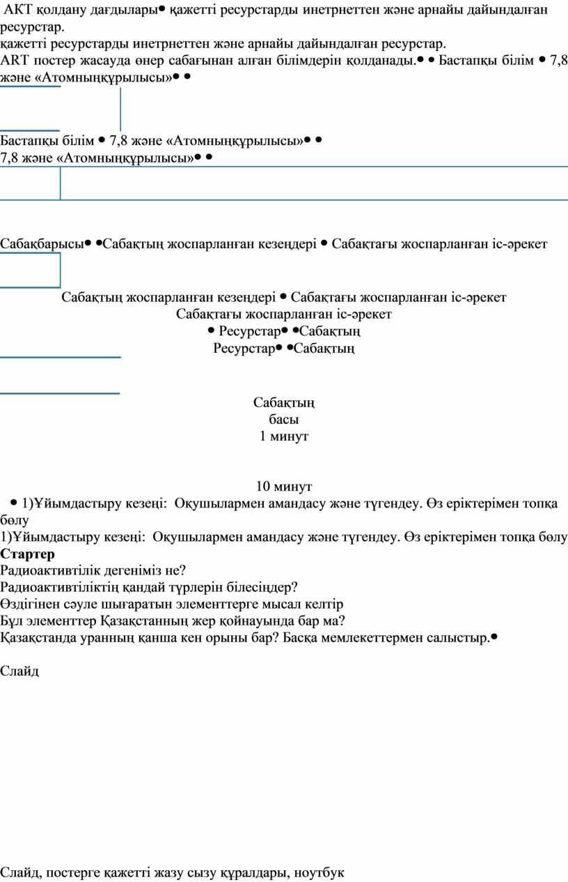 1)Ұйымдастыру кезеңі: Оқушылармен амандасу және түгендеу. Өз еріктерімен топқа бөлу Стартер Радиоактивтілік дегеніміз не? Радиоактивтіліктің қандай түрлерін білесіңдер? Өздігінен сәуле шығаратын элементтерге мысал келтір Бұл элементтер Қазақстанның жер қойнауында бар ма? Қазақстанда уранның қанша кен орыны бар? Басқа мемлекеттермен салыстыр. |