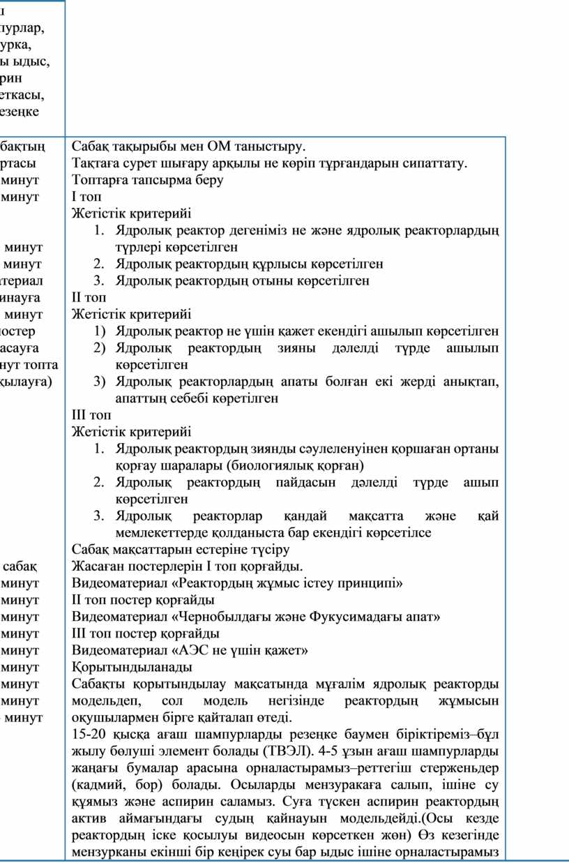 Сабақ тақырыбы мен ОМ таныстыру. Тақтаға сурет шығару арқылы не көріп тұрғандарын сипаттату. Топтарға тапсырма беру І топ Жетістік критерийі 1. Ядролық реактор дегеніміз не және ядролық реакторлардың түрлері көрсетілген 2. Ядролық реактордың құрлысы көрсетілген 3. Ядролық реактордың отыны көрсетілген ІІ топ Жетістік критерийі 1) Ядролық реактор не үшін қажет екендігі ашылып көрсетілген 2) Ядролық реактордың зияны дәлелді түрде ашылып көрсетілген 3) Ядролық реакторлардың апаты болған екі жерді анықтап, апаттың себебі көретілген ІІІ топ Жетістік критерийі 1. Ядролық реактордың зиянды сәулеленуінен қоршаған ортаны қорғау шаралары (биологиялық қорған) 2. Ядролық реактордың пайдасын дәлелді түрде ашып көрсетілген 3. Ядролық реакторлар қандай мақсатта және қай мемлекеттерде қолданыста бар екендігі көрсетілсе Сабақ мақсаттарын естеріне түсіру Жасаған постерлерін І топ қорғайды. Видеоматериал «Реактордың жұмыс істеу принципі» ІІ топ постер қорғайды Видеоматериал «Чернобылдағы және Фукусимадағы апат» ІІІ топ постер қорғайды Видеоматериал «АЭС не үшін қажет» Қорытындыланады Сабақты қорытындылау мақсатында мұғалім ядролық реакторды модельдеп, сол модель негізінде реактордың жұмысын оқушылармен бірге қайталап өтеді. 15-20 қысқа ағаш шампурларды резеңке баумен біріктіреміз–бұл жылу бөлуші элемент болады (ТВЭЛ). 4-5 ұзын ағаш шампурларды жаңағы бумалар арасына орналастырамыз–реттегіш стерженьдер (кадмий, бор) болады. Осыларды мензуракаға салып, ішіне су құямыз және аспирин саламыз. Суға түскен аспирин реактордың актив аймағындағы судың қайнауын модельдейді.(Осы кезде реактордың іске қосылуы видеосын көрсеткен жөн) Өз кезегінде мензурканы екінші бір кеңірек суы бар ыдыс ішіне орналастырамыз да, оның ішіне де аспирин саламыз–бұл реактордың екінші контурындағы судың қайнауын модельдейді |