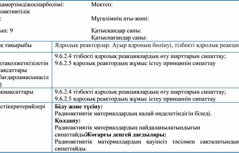 9.6.2.4 тізбекті ядролық реакциялардың өту шарттарын сипаттау; 9.6.2.5 ядролық реактордың жұмыс істеу принципін сипаттау |
