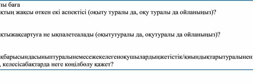 Жалпы баға Сабақтың жақсы өткен екі аспектісі (оқыту туралы да, оқу туралы да ойланыңыз)? 1: 2: Сабақтыжақсартуға не ықпалетеалады (оқытутуралы да, оқутуралы да ойланыңыз)? 1: 2: Сабақбарысындасыныптуралынемесежекелегеноқушылардыңжетістік/қиындықтарытуралыненібілдім, келесісабақтарда неге көңілбөлу қажет? |