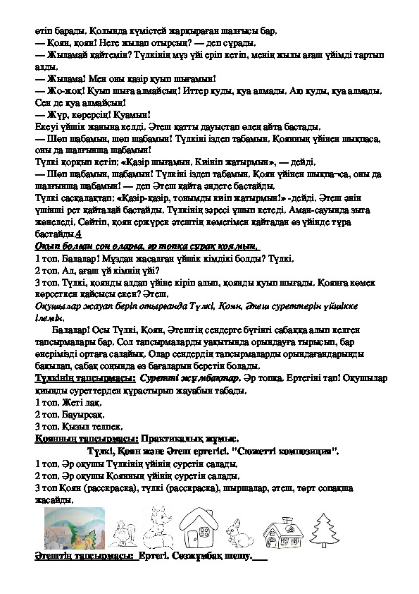3 топ. Түлкі, қоянды алдап үйіне кіріп алып, қоянды қуып шығады. Қоянға көмек