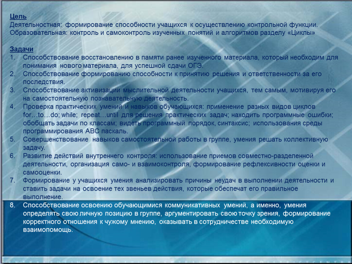 Образовательная: контроль и самоконтроль изученных понятий и алгоритмов разделу «Циклы»
