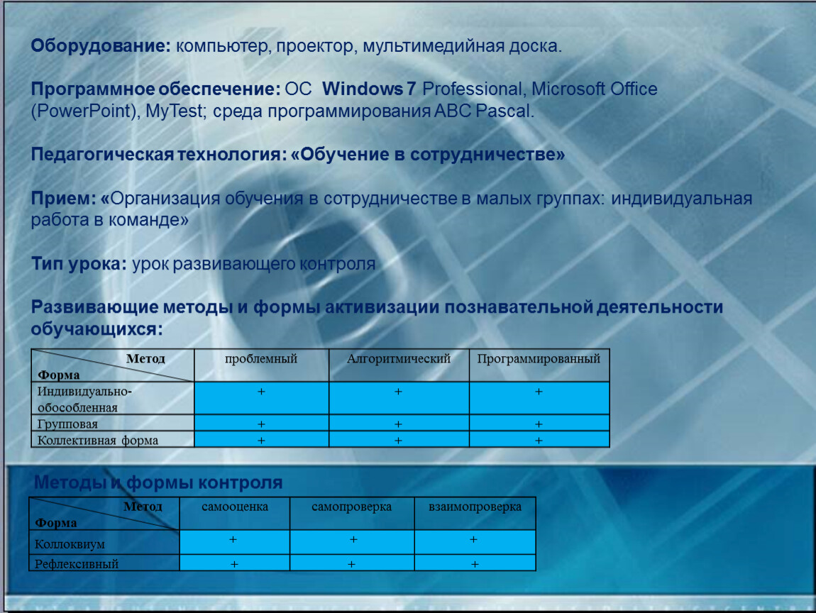 Программное обеспечение: ОС Windows 7 Professional, Microsoft Office (PowerPoint), MyTest; среда программирования ABC Pascal.