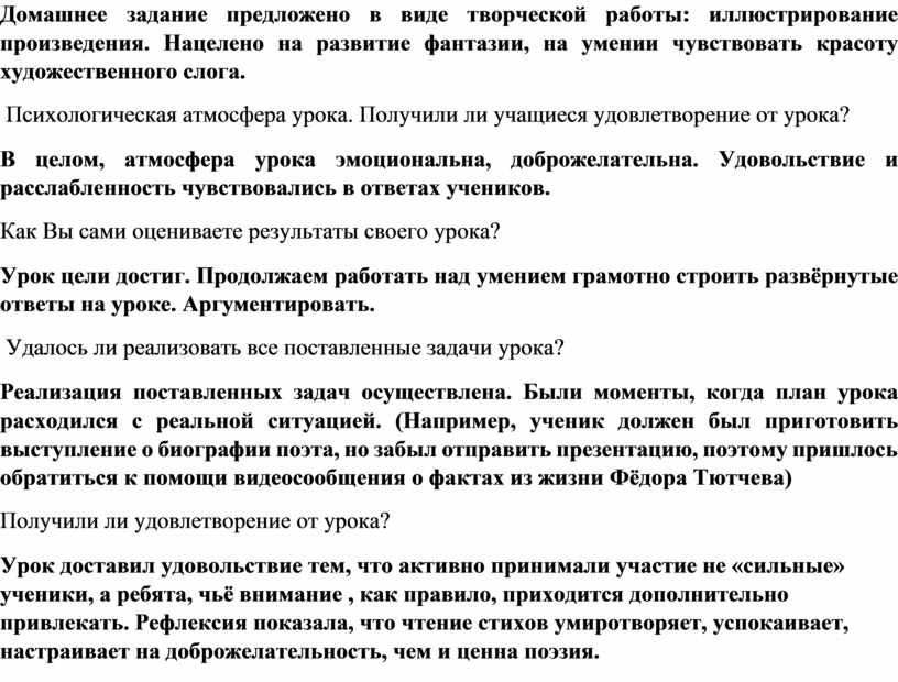 Реализация поставленных задач осуществлена. Были моменты, когда план урока расходился с реальной ситуацией. (Например, ученик должен был приготовить выступление о биографии поэта, но забыл отправить презентацию, поэтому пришлось обратиться к помощи видеосообщения о фактах из жизни Фёдора Тютчева)