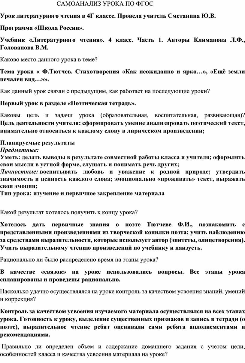 САМОАНАЛИЗ УРОКА ПО ФГОС