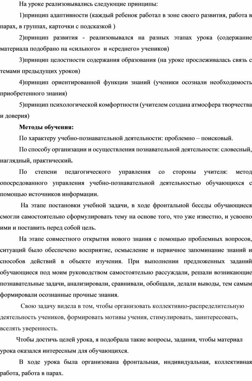 1)принцип адаптивности (каждый ребенок работал в зоне своего развития, работа в парах, в группах, карточки с подсказкой )