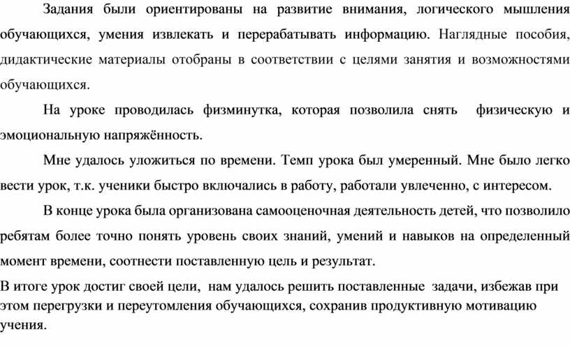 В итоге урок достиг своей цели, нам удалось решить поставленные задачи, избежав при этом перегрузки и переутомления обучающихся, сохранив продуктивную мотивацию учения.