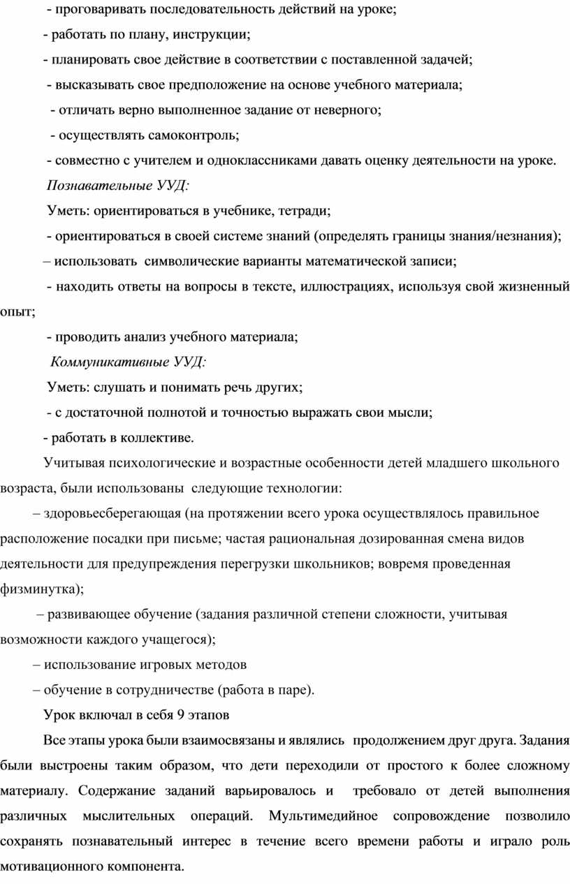 Все этапы урока были взаимосвязаны и являлись продолжением друг друга. Задания были выстроены таким образом, что дети переходили от простого к более сложному материалу. Содержание заданий варьировалось и требовало от детей выполнения различных мыслительных операций. Мультимедийное сопровождение позволило сохранять познавательный интерес в течение всего времени работы и играло роль мотивационного компонента.