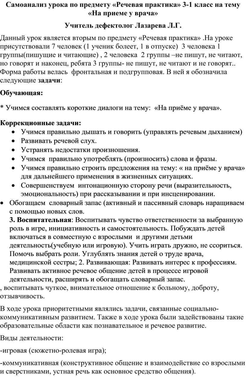 Самоанализ урока по предмету «Речевая практика» 3-1 класс на тему «На приеме у врача»