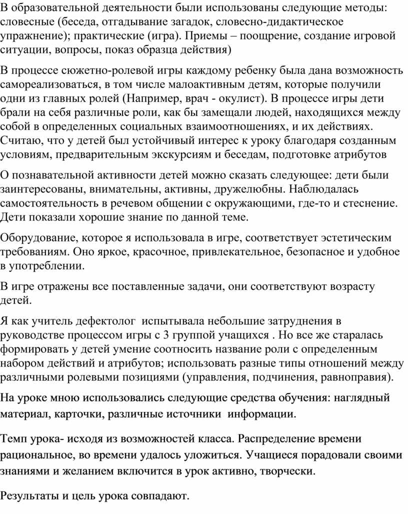 В процессе сюжетно-ролевой игры каждому ребенку была дана возможность самореализоваться, в том числе малоактивным детям, которые получили одни из главных ролей (Например, врач - окулист). В процессе игры дети брали на себя различные роли, как бы замещали людей, находящихся между собой в определенных социальных взаимоотношениях, и их действиях. Считаю, что у детей был устойчивый интерес к уроку благодаря созданным условиям, предварительным экскурсиям и беседам, подготовке атрибутов