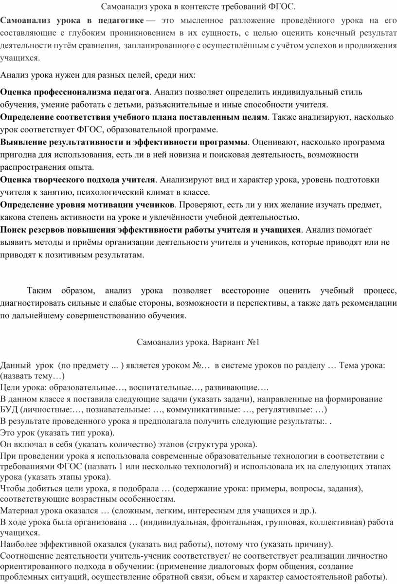 Самоанализ урока в контексте требований ФГОС.