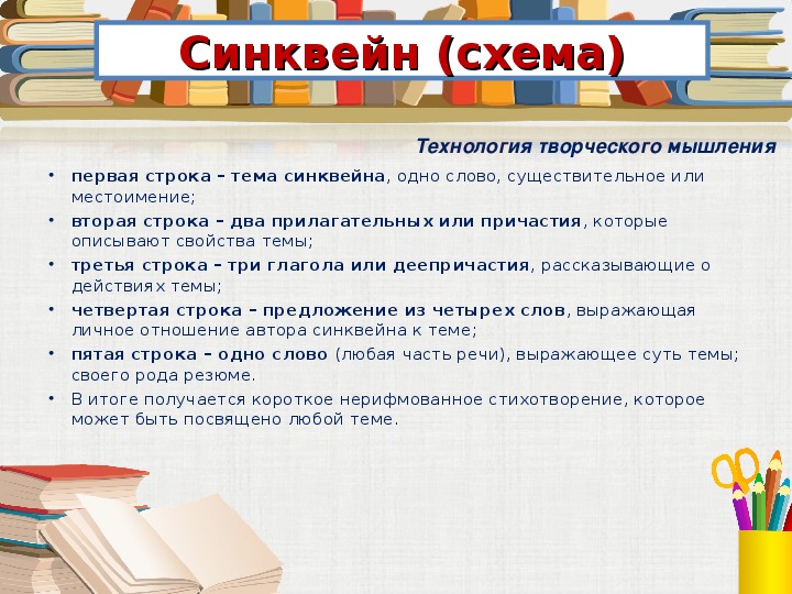 • пятая строка – одно слово (любая часть речи), выражающее суть темы;