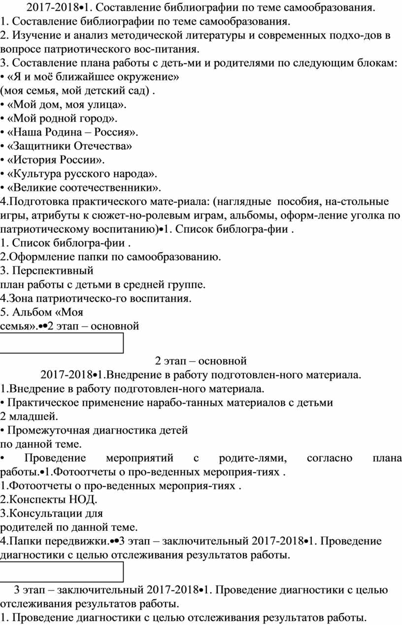 1. Список библогра-фии . 2.Оформление папки по самообразованию. 3. Перспективный план работы с детьми в средней группе. 4.Зона патриотическо-го воспитания. 5. Альбом «Моя семья». |