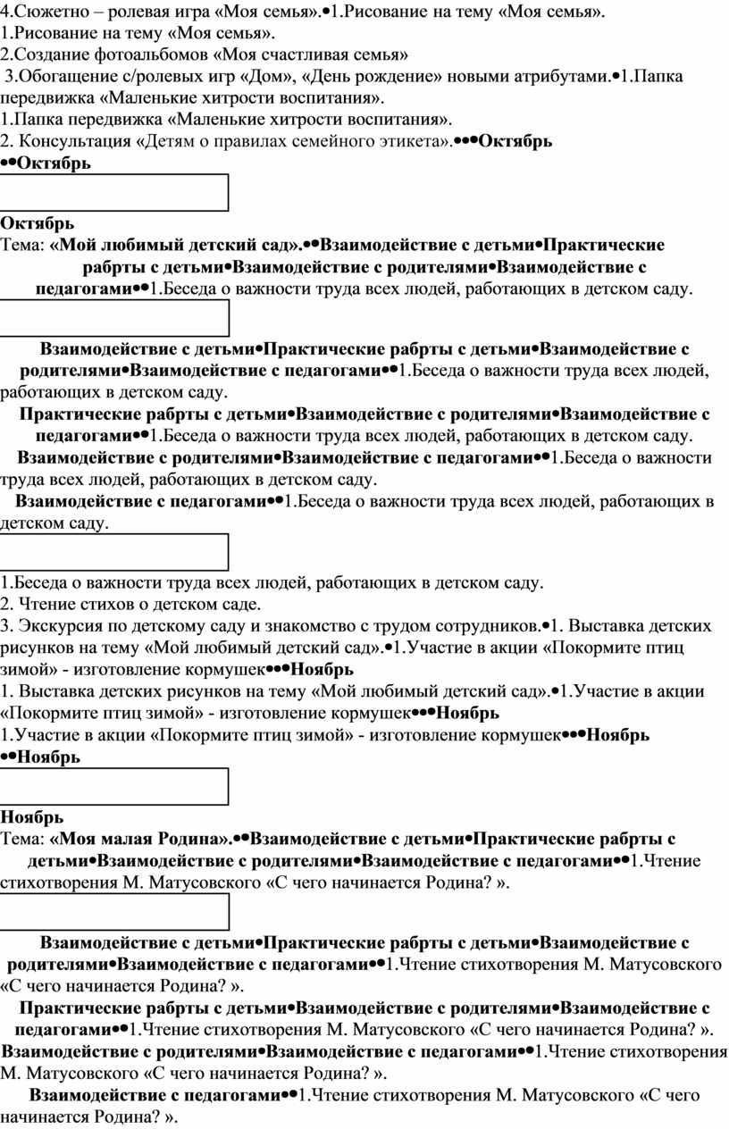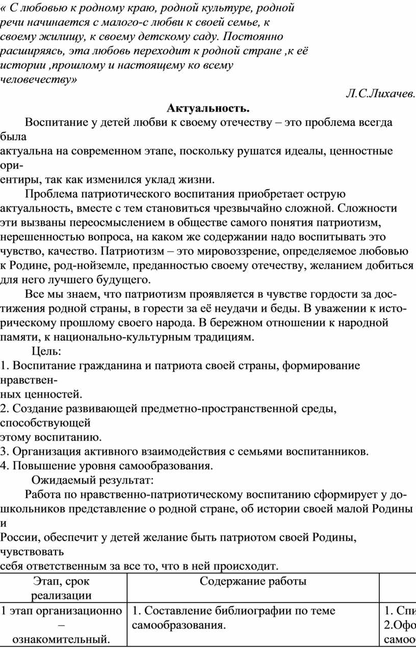 1. Составление библиографии по теме самообразования. 2. Изучение и анализ методической литературы и современных подхо-дов в вопросе патриотического вос-питания. 3. Составление плана работы с деть-ми и родителями по следующим блокам: • «Я и моё ближайшее окружение» (моя семья, мой детский сад) . • «Мой дом, моя улица». • «Мой родной город». • «Наша Родина – Россия». • «Защитники Отечества» • «История России». • «Культура русского народа». • «Великие соотечественники». 4.Подготовка практического мате-риала: (наглядные пособия, на-стольные игры, атрибуты к сюжет-но-ролевым играм, альбомы, оформ-ление уголка по патриотическому воспитанию) |