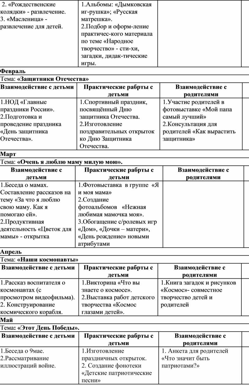 1.НОД «Главные праздники России». 2.Подготовка и проведение праздника «День защитника Отечества». |