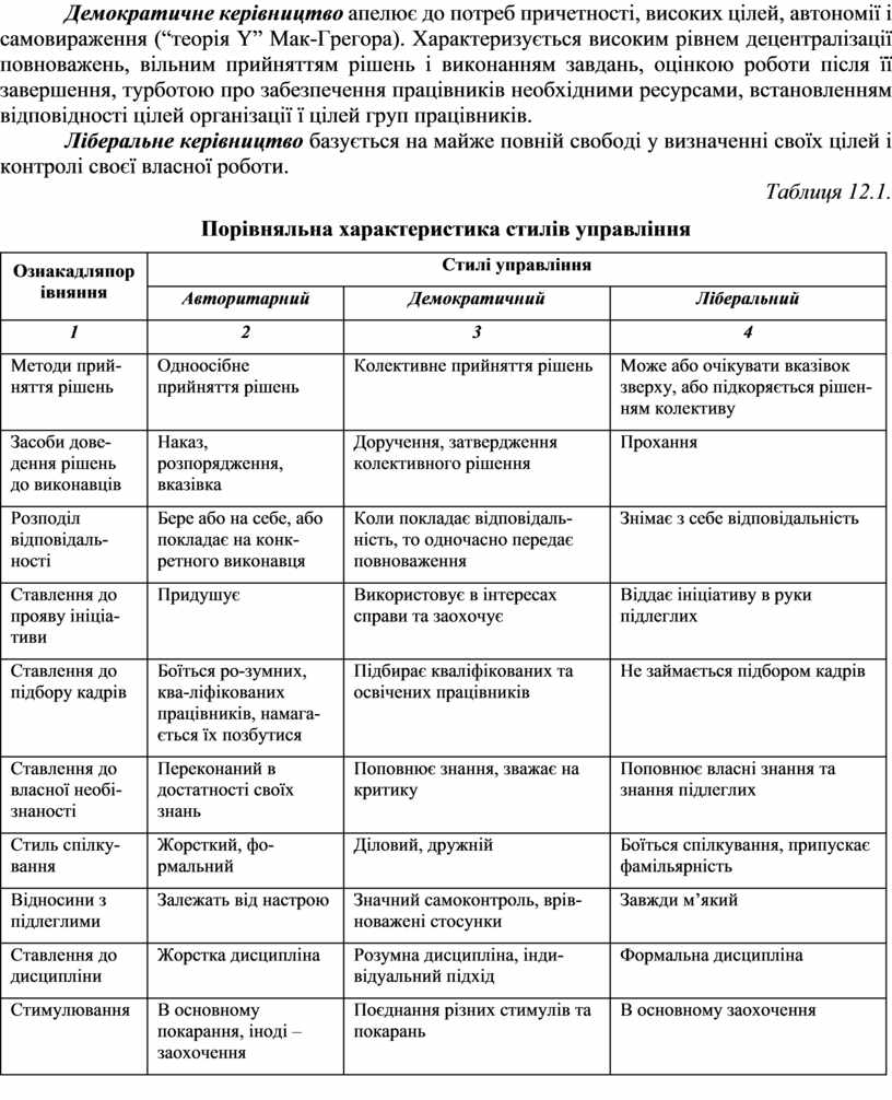 Демократичне керівництво апелює до потреб причетності, високих цілей, автономії і самовираження (“теорія Y” Мак-Грегора). Характеризується високим рівнем децентралізації повноважень, вільним прийняттям рішень і виконанням завдань, оцінкою роботи після її завершення, турботою про забезпечення працівників необхідними ресурсами, встановленням відповідності цілей організації ї цілей груп працівників.