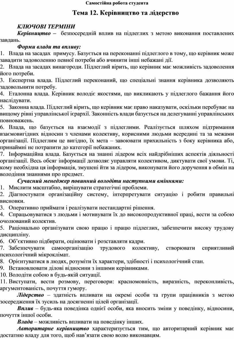 Лідерство – здатність впливати на окремі особи та групи працівників з метою зосередження їх зусиль на досягненні цілей організації.