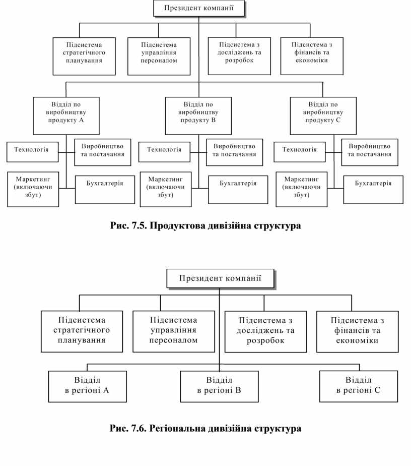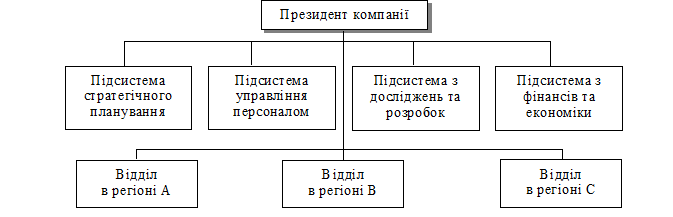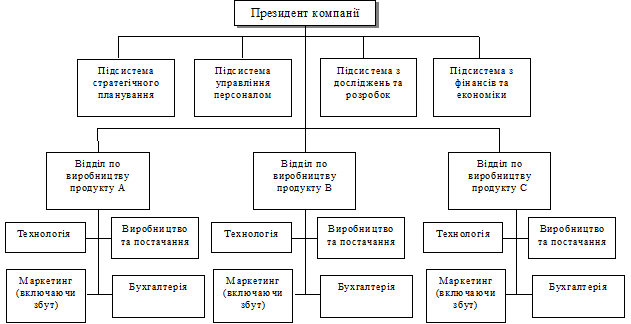 Дивізійно-продуктова структура управління, дивізійна структура, орієнтована на споживача (географічні ринки) |