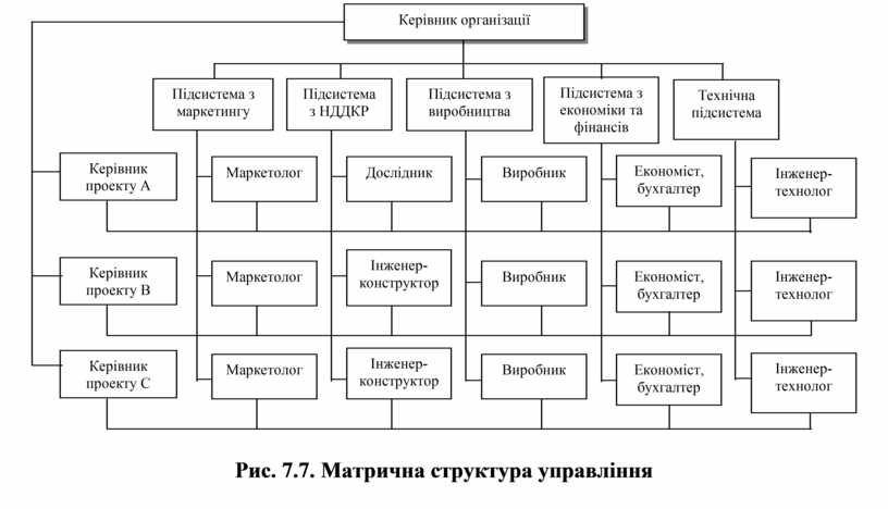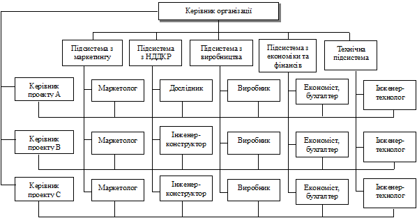 Тимчасова структура, яка створюється для вирішення конкретного завдання. Її суть зводиться до підбо-ру в команду найкваліфікованіших працівників організації для втілення складного проекту в стислий термін з визначеним рівнем якості, в межах визначеного кошторису. Після завершення проекту команда ліквідовується, її члени або переходять в інший проект, або повертаються до постійної роботи, або звільняються з організації. |