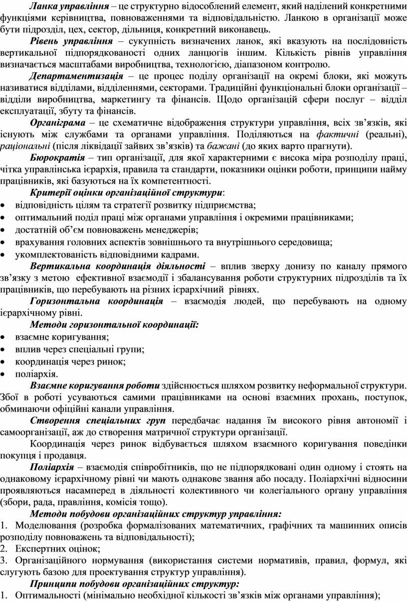Структура управління – це упорядкована сукупність взаємопов’язаних елементів системи, що визначає поділ праці і службових зв’язків між структурними підрозділами і працівниками апарату управління з питань підготовки, прийняття і реалізації управлінських рішень. Іншими словами це сукупність організаційно впорядкованих відносин та зв’язків між ланками і рівнями керівництва.