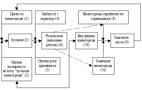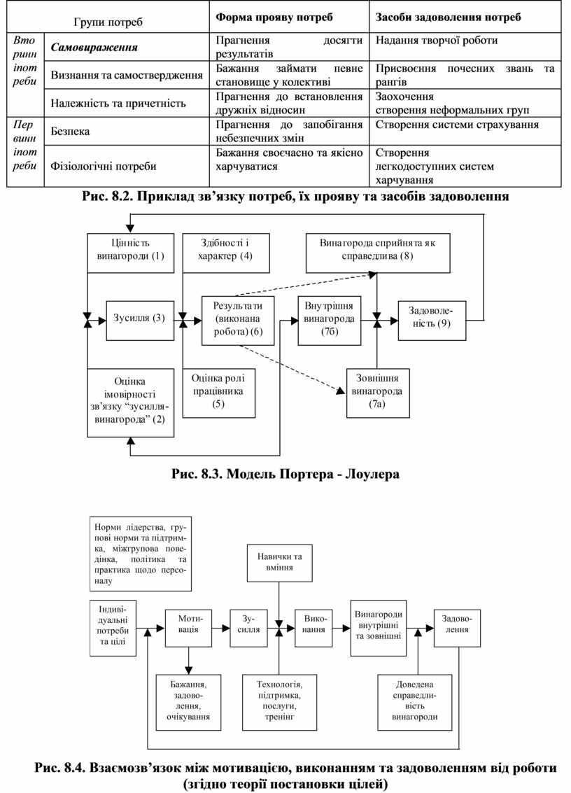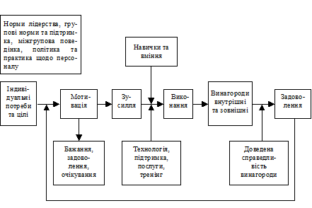 Рис. 8.4. Взаємозв’язок між мотивацією, виконанням та задоволенням від роботи (згідно теорії постановки цілей)