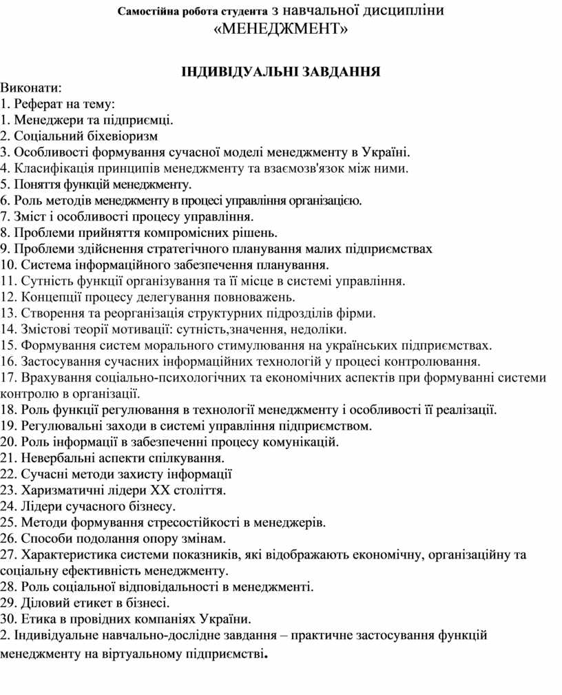 2. Індивідуальне навчально-дослідне завдання – практичне застосування функцій менеджменту на віртуальному підприємстві.