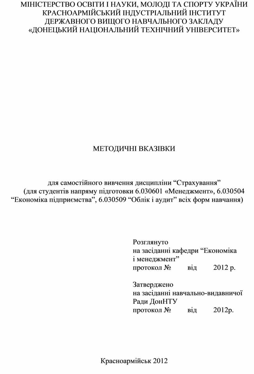 Методичні вказівки призначені для самостійного вивчення дисципліни “Страхування” студентами спеціальностей 6.050201 „Менеджмент організацій”, 6.050107 “Економіка підприємства”, 6.050106  “Облік і аудит”  та охоплюють усі види робіт при вивченні курсу студентами і відображає основні методичні вимоги кафедри «Економіка і менеджмент».