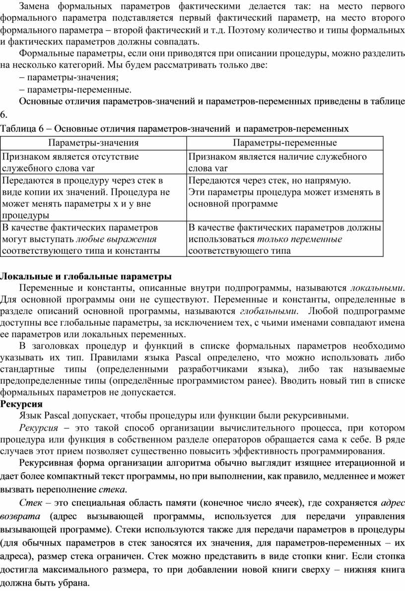 Основные отличия параметров-значений и параметров-переменных приведены в таблице 6.